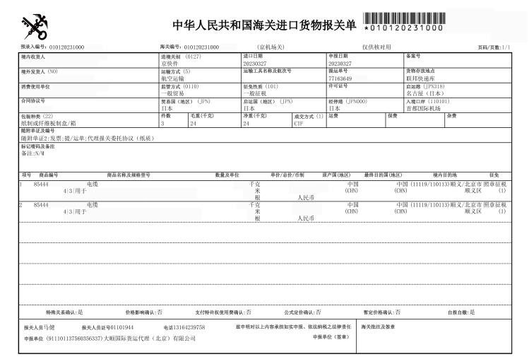 快件進(jìn)口報(bào)關(guān)報(bào)關(guān)單(樣例)
