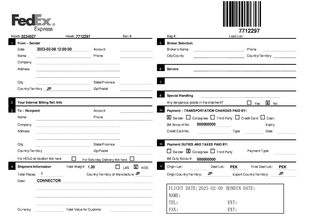 快件進(jìn)口報關(guān)快遞面單(樣例)