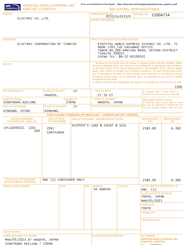 海運(yùn)小提單(樣例)