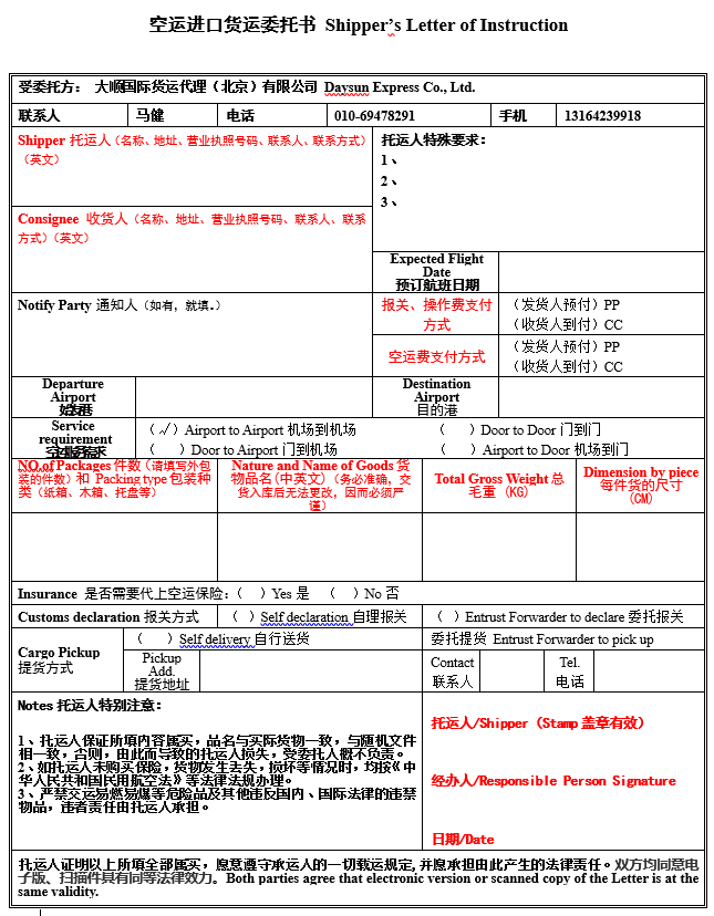 大順空運進口委托書(模板)