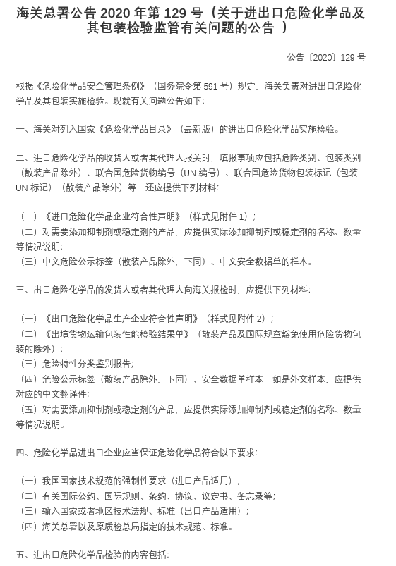 海關(guān)總署公告2020年第129號(關(guān)于進出口危險化學品及其包裝檢驗監(jiān)管有關(guān)問題的公告 )