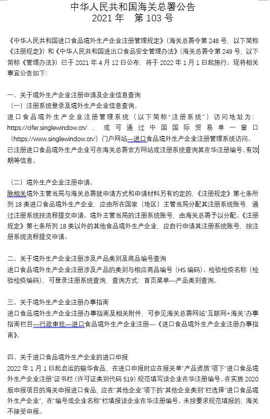 海關(guān)總署公告2021年第103號 (關(guān)于中華人民共和國進(jìn)口食品境外生產(chǎn)企業(yè)注冊管理規(guī)定和中華人民共和國進(jìn)出口食品安全管理辦法實施相關(guān)事宜的公告)