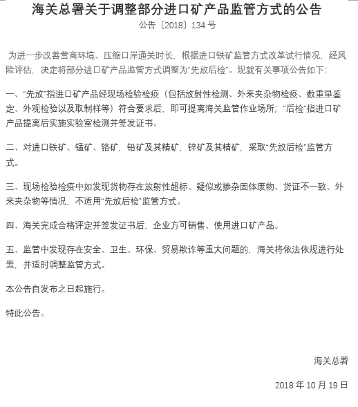海關(guān)總署關(guān)于調(diào)整部分進口礦產(chǎn)品監(jiān)管方式的公告