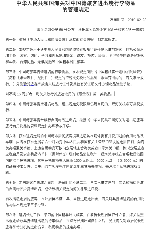 中華人民共和國(guó)海關(guān)對(duì)中國(guó)籍旅客進(jìn)出境行李物品 的管理規(guī)定