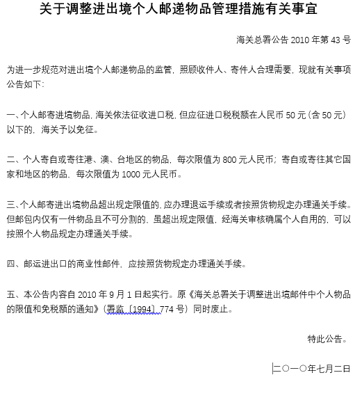 關于調整進出境個人郵遞物品管理措施有關事宜