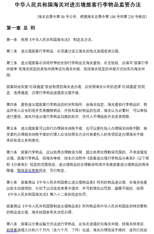 中華人民共和國海關(guān)對進出境旅客行李物品監(jiān)管辦法