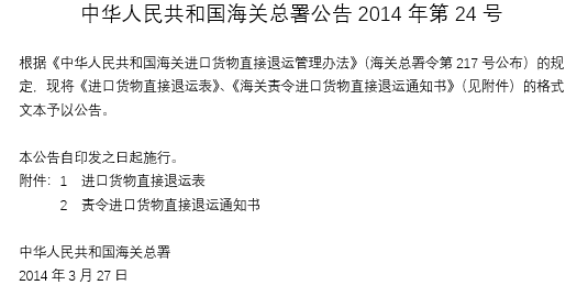 海關(guān)總署公告2014年第24號(關(guān)于執(zhí)行中華人民共和國海關(guān)進(jìn)口貨物直接退運(yùn)管理辦法有關(guān)問題的公告)
